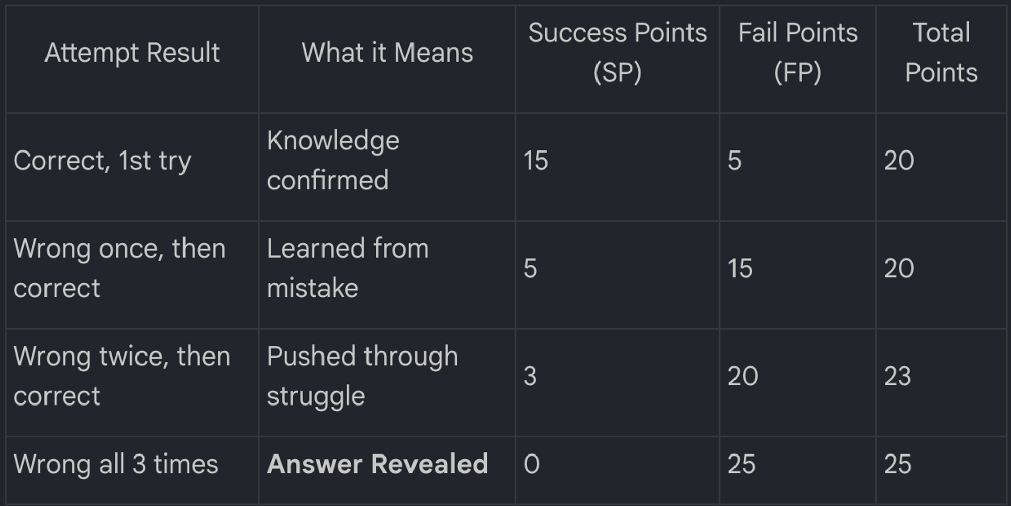 FailFast awards Success Points when you answer correctly and Fail Points when you keep trying after a miss.